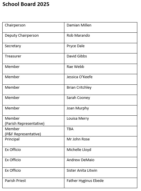 The Catholic School Advisory Council is comprised of the Principal, the Parish Priest, four to six persons elected from the school community, a Parish Council representative and a P&F representative. Ex-officio members for the School Board include the Principal, Assistant Principals, Parish Priest and our Sisters.